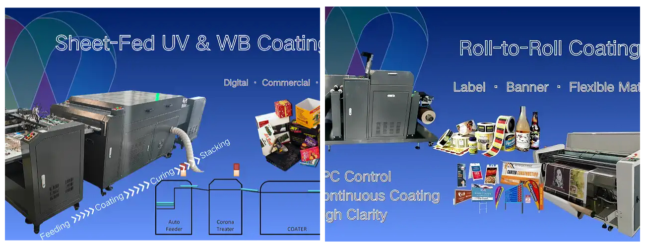 أنظمة طلاء احترافية بالأشعة فوق البنفسجية وأنظمة طلاء مائية · تغذية بالورق · تغذية باللفائف · تنسيق عريض · تكامل مخصص